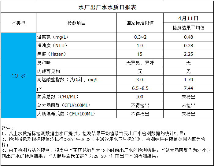 水廠出廠水水質(zhì)日?qǐng)?bào)表(2025-4-11)