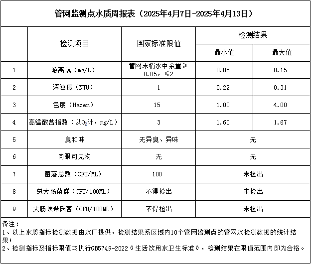 管網(wǎng)監(jiān)測(cè)點(diǎn)水質(zhì)周報(bào)表(2025年4月7日-2025年4月13日)