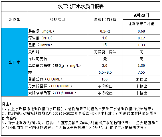 水廠出廠水水質日報表(2025-9-20)