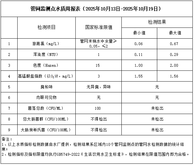 管網(wǎng)監(jiān)測點水質(zhì)周報表(2025年10月13日-2025年10月19日)