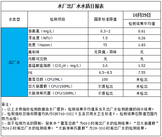 水廠出廠水水質(zhì)日?qǐng)?bào)表(2025-10-29)