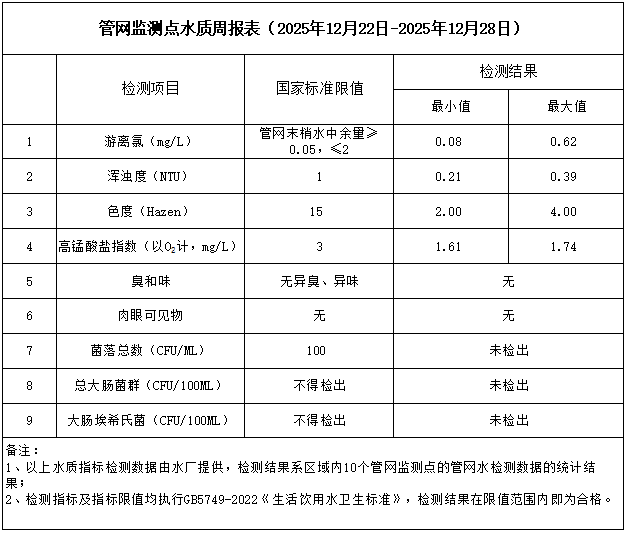 管網(wǎng)監(jiān)測(cè)點(diǎn)水質(zhì)周報(bào)表(2025年12月22日-2025年12月28日)