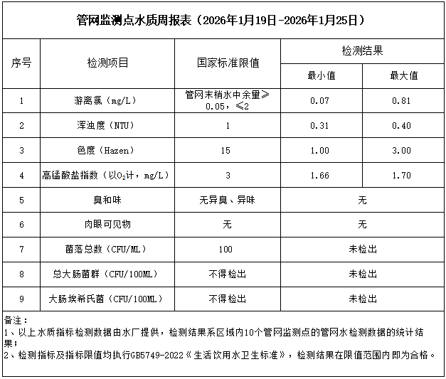 管網(wǎng)監(jiān)測點水質(zhì)周報表(2026年1月19日-2026年1月25日)
