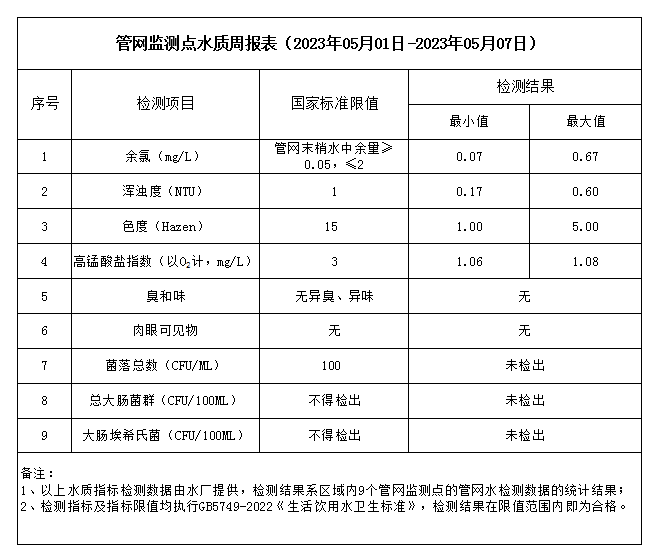 管網監(jiān)測點水質周報表(2023年05月01日-2023年05月07日)