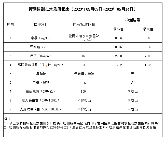 管網(wǎng)監(jiān)測點水質周報表(2023年05月08日-2023年05月14日)