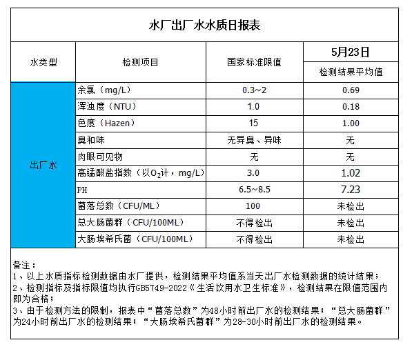 水廠出廠水水質(zhì)日?qǐng)?bào)表(2023-5-23)