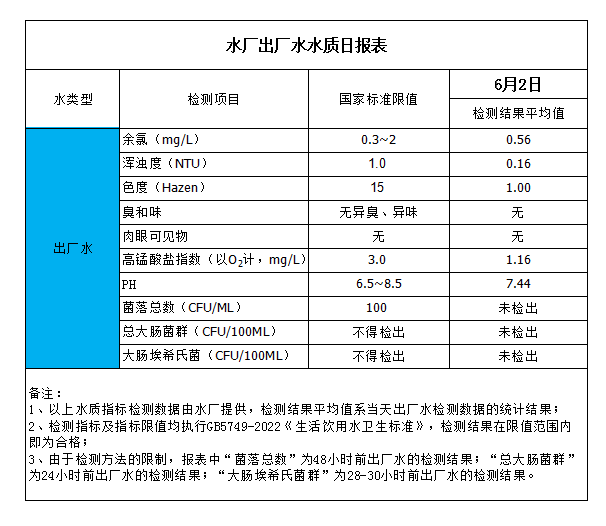 水廠出廠水水質日報表(2023-6-2)