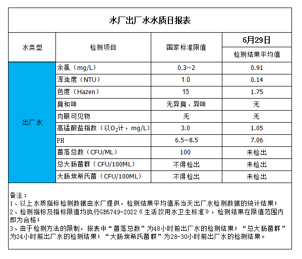 水廠出廠水水質(zhì)日報(bào)表(2023-6-29)