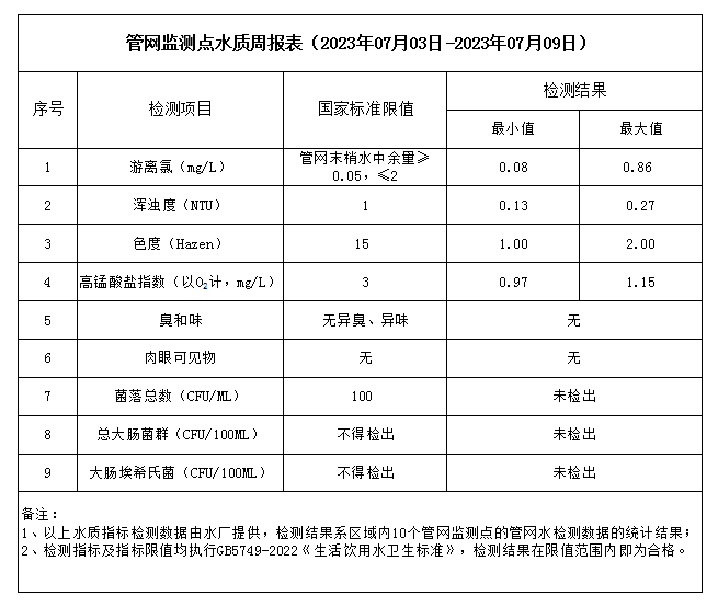 管網(wǎng)監(jiān)測點水質周報表(2023年07月03日-2023年07月09日)