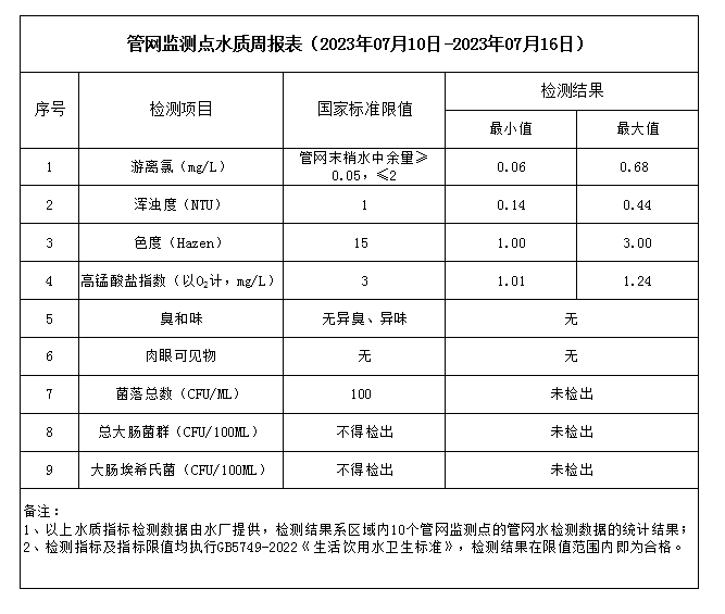 管網(wǎng)監(jiān)測(cè)點(diǎn)水質(zhì)周報(bào)表(2023年07月10日-2023年07月16日)