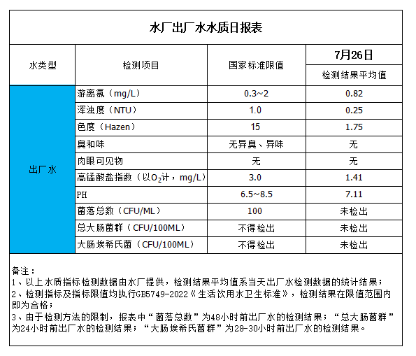 水廠出廠水水質(zhì)日?qǐng)?bào)表(2023-7-26)