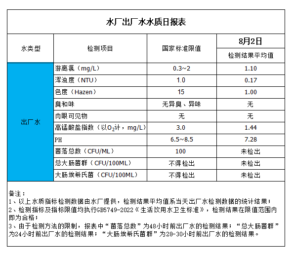 水廠出廠水水質(zhì)日報表(2023-8-2)