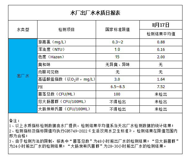 水廠出廠水水質(zhì)日?qǐng)?bào)表(2023-8-17)