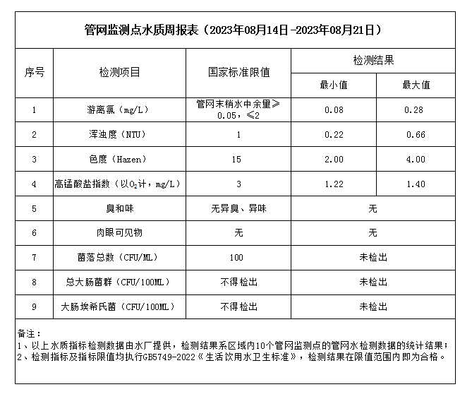 管網監(jiān)測點水質周報表(2023年08月14日-2023年08月21日)