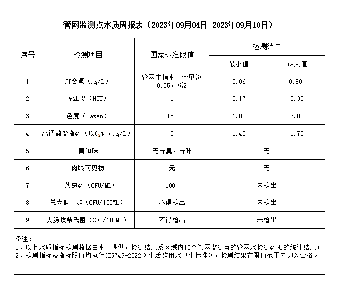管網(wǎng)監(jiān)測(cè)點(diǎn)水質(zhì)周報(bào)表(2023年09月04日-2023年09月10日)