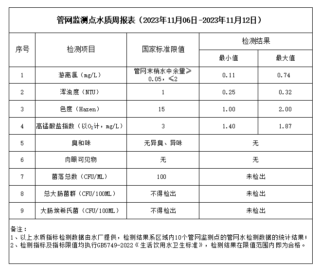 管網(wǎng)監(jiān)測點(diǎn)水質(zhì)周報表(2023年11月06日-2023年11月12日)