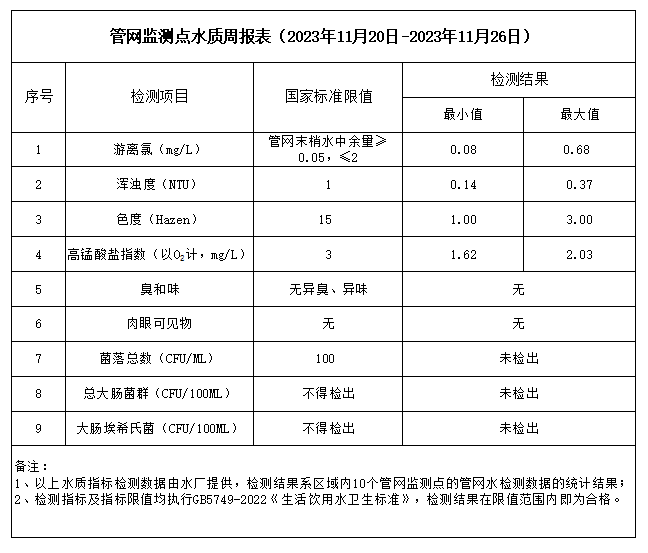 管網(wǎng)監(jiān)測點水質(zhì)周報表(2023年11月20日-2023年11月26日)