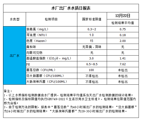 水廠出廠水水質(zhì)日?qǐng)?bào)表(2023-12-22)