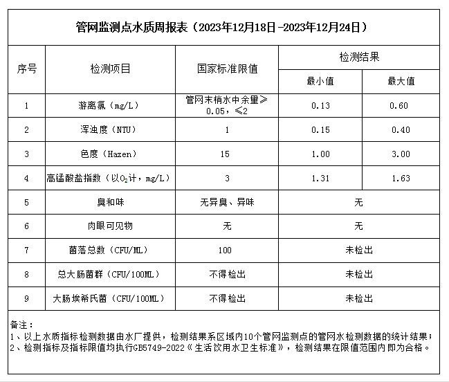 管網(wǎng)監(jiān)測(cè)點(diǎn)水質(zhì)周報(bào)表(2023年12月18日-2023年12月24日)