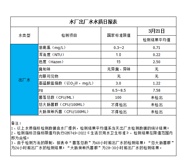 水廠出廠水水質(zhì)日?qǐng)?bào)表(2024-3-21)