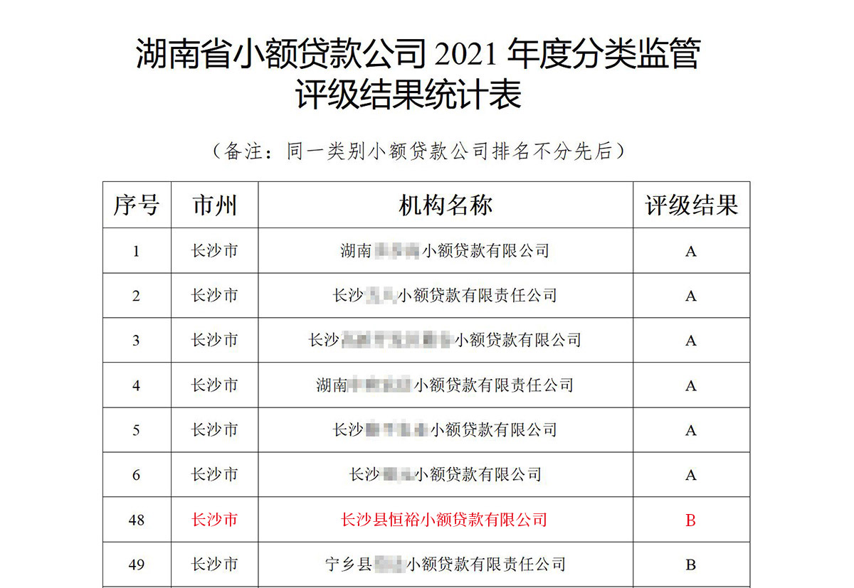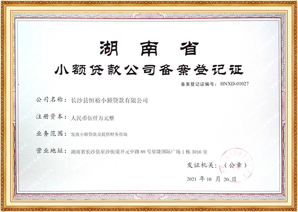 長沙縣恒裕小額貸款有限公司于2012年3月29日設(shè)立,經(jīng)營范圍主要為家電批發(fā)零售流動貸款;國家政策允許的農(nóng)村家電消費(fèi)貸款;“三農(nóng)”和中小企業(yè)需求的金融業(yè)務(wù);為中小企業(yè)發(fā)展、管理、財務(wù)等咨詢業(yè)務(wù)及其他經(jīng)批準(zhǔn)的業(yè)務(wù)。多年來,一直被湖南省金融辦監(jiān)管評級為B級資質(zhì)單位。